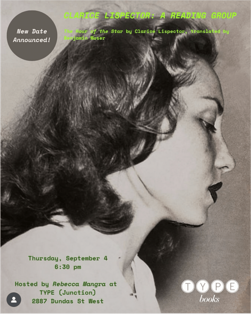 Join us on Thursday, September 4 at 6:30 pm for a drop-in reading group celebrating the work of the writer Clarice Lispector. For our first session, we will be discussing THE HOUR OF THE STAR (translated from Portuguese by Benjamin Moser) 🤍